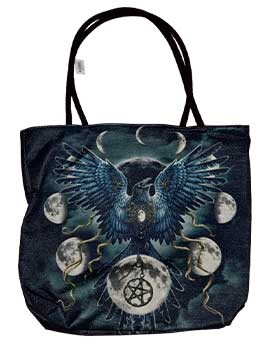 Large jute tote with the image of a crow having his wings expanded fully surrounded. Dark night sky with an artistic design of the moon phases. The design repeats on both sides of this tote bag. Made with durable fabric with rope handle.