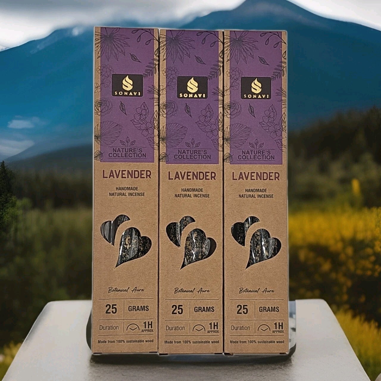 3 Boxes of Sonavi Premium Handcrafted Lavender Incense Sticks. 25gm per box.