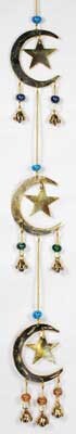 Three brass Moon and Star symbols hang from beaded chains on this special wind chime. A beautiful piece for the home or sacred space, offering the musical ringing of brass bells alongside stylized images of stars and moons.