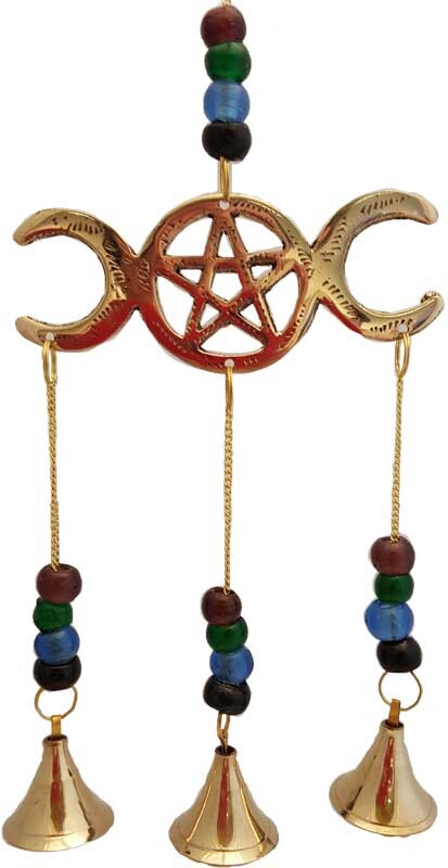 Representing the aspects of the Triple Goddess, this wind chime makes a beautiful display piece. The Triple moon symbol is all metal with 3 bells suspended on a gold toned chain and decorated with 4 colorful glass beads. Overall 10"